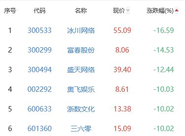 冰川网络、富春股份、盛天网络、奥飞娱乐、浙数文化、三六零位列涨幅榜后五位,涨幅分别为-16.59%、-14.53%、-12.44%、-10.03%、-10.02%、-10.02%。