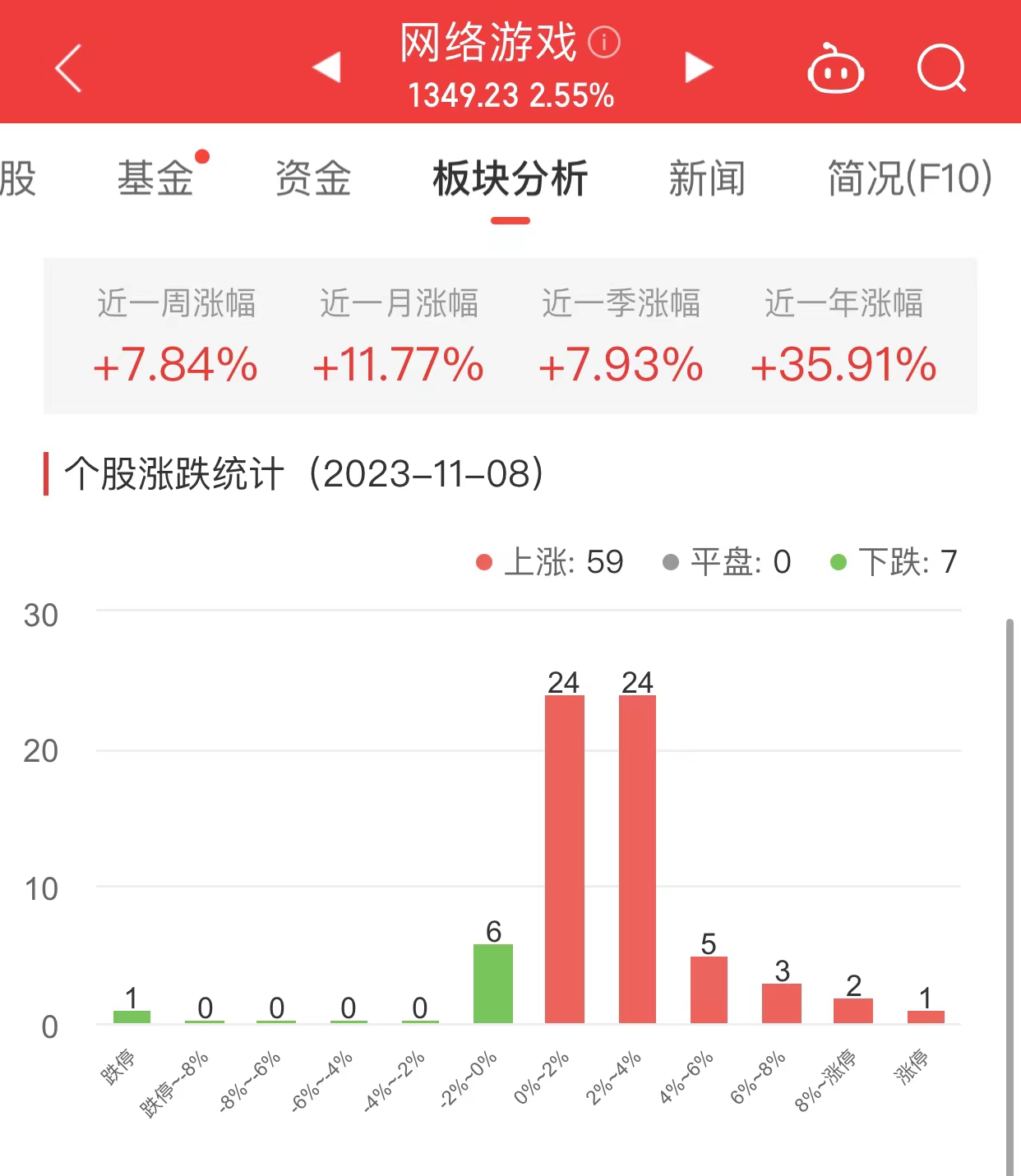 中国经济网北京11月8日讯今日,网络游戏板块整体涨幅2.55%,其中59只股票上涨,0只股票平盘,7只股票下跌。