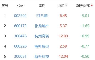 ST八菱、卧龙地产、杭州高新、瀚叶股份、琏升科技位列涨幅榜后五位,涨幅分别为-5.01%、-1.65%、-0.99%、-0.77%、-0.50%。
