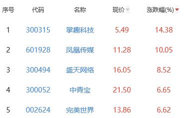 其中,掌趣科技、凤凰传媒、盛天网络、中青宝、完美世界位列板块涨幅前五位,涨幅分别为14.38%、10.05%、8.52%、6.65%、6.62%。