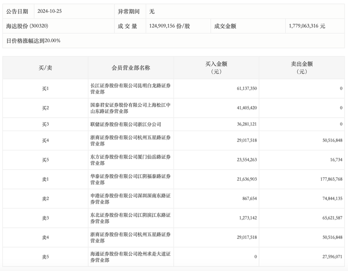 10月25日,海达股份今日涨停,龙虎榜数据显示,上榜营业部席位全天成交6.12亿元,占当日总成交金额比例为34.38%。其中,买入金额为2.15亿元,卖出金额为3.96亿元,合计净卖出1.81亿元。