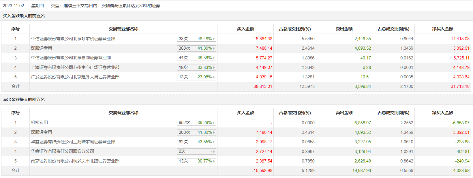 银邦股份11月2日涨8.83%,全天换手率达28.81%,振幅达9.63%。龙虎榜数据显示,11月1日至11月2日期间,上榜营业部席位合计净买入2.4亿元。其中,机构合计净卖出6858.97万元。此外,中信证券北京呼家楼证券营业部、深股通专用分别买入1.69亿元、7486.14万元;深股通专用、华鑫证券上海陆家嘴证券营业部分别卖出4093.52万元、3227.05万元。