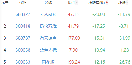 云从科技、昆仑万维、海天瑞声、蓝色光标和同花顺位列涨幅榜后五位,涨幅分别为-20.00%、-17.25%、-15.31%、-13.94%和-12.16%。