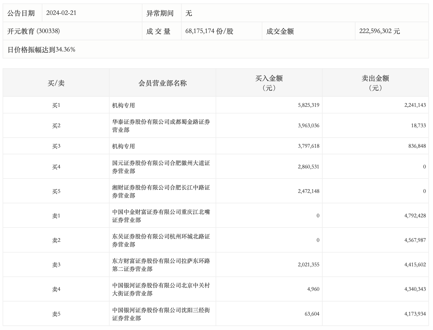 2月21日,开元教育今日涨12.84%,龙虎榜数据显示,上榜营业部席位全天成交4639.56万元,占当日总成交金额比例为20.84%。其中,买入金额为2100.86万元,卖出金额为2538.7万元,合计净卖出437.84万元。