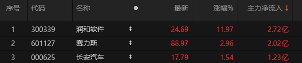 3只个股主力资金净流入额超1亿元 润和软件居首