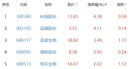 其中,科恒股份、冠福股份、圣诺生物、湘财股份、苑东生物位列板块涨幅前五位,涨幅分别为4.38%、4.11%、3.49%、2.95%、2.02%。