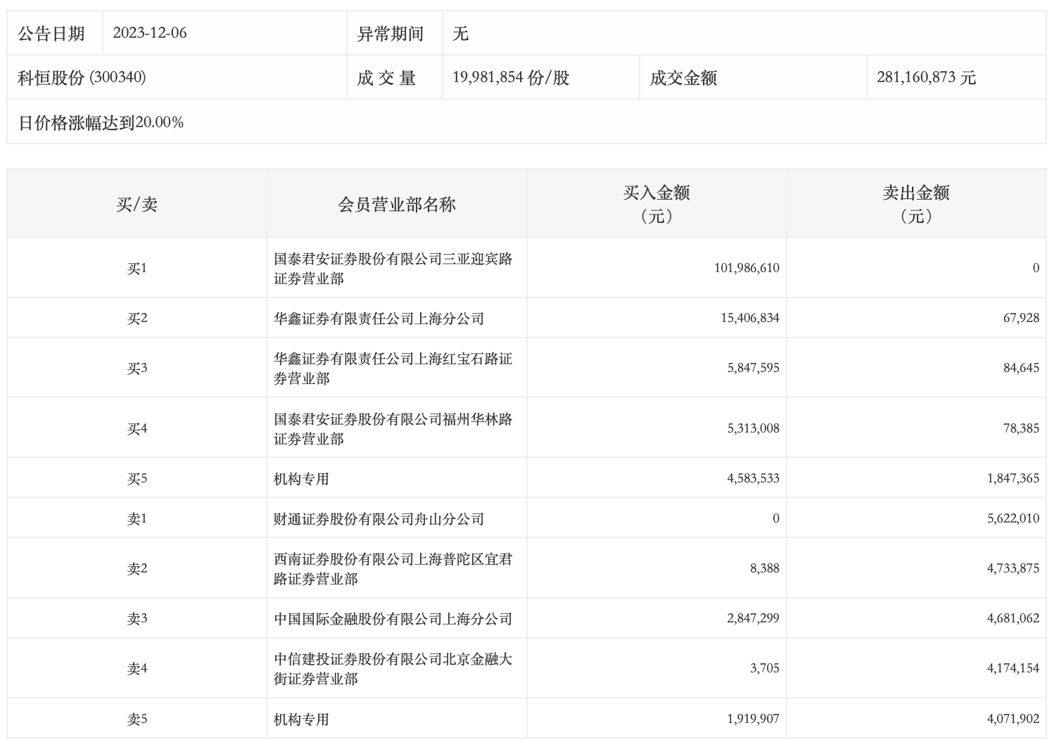12月6日,科恒股份今日涨停,龙虎榜数据显示,上榜营业部席位全天成交1.63亿元,占当日总成交金额比例为58.07%。其中,买入金额为1.38亿元,卖出金额为2536.13万元,合计净买入1.13亿元。