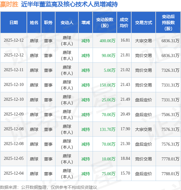 赢时胜近半年内的董监高及核心技术人员增减持详情如下:
