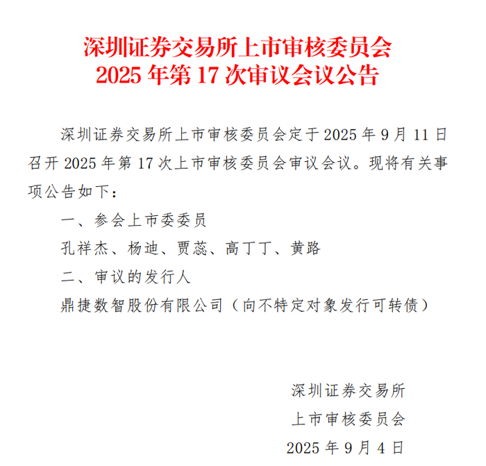 9月4日 ,深交所上市审核委员会发布公告,定于2025年9月11日审议鼎捷数智股份有限公司(以下简称“鼎捷数智”)向不特定对象发行可转债的申请。