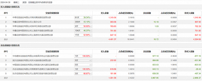 溢多利4月30日涨停,龙虎榜数据显示,上榜营业部席位全天成交9387.62万元,占当日总成交金额比例为22.7%。其中,买入金额为5402.95万元,卖出金额为3984.67万元,合计净买入1418.28万元。