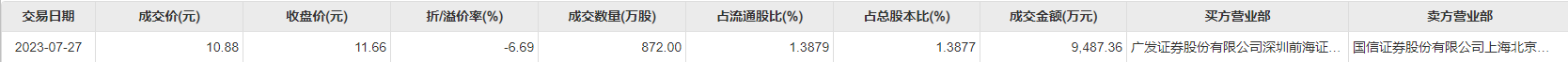 7月27日大宗交易成交872万股,成交额9487.36万元,占当日总成交额的64.33%,成交价10.88元,较市场收盘价11.66元折价6.69%。