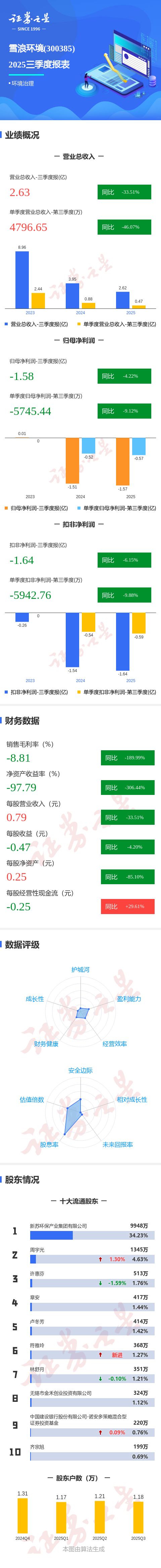 图解雪浪环境三季报:第三季度单季净利润同比下降9.12%