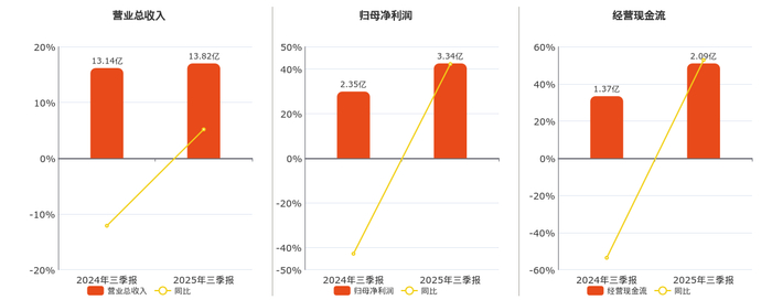 公司营业总收入为13.82亿元。归母净利润为3.34亿元。经营活动现金净流入为2.09亿元。