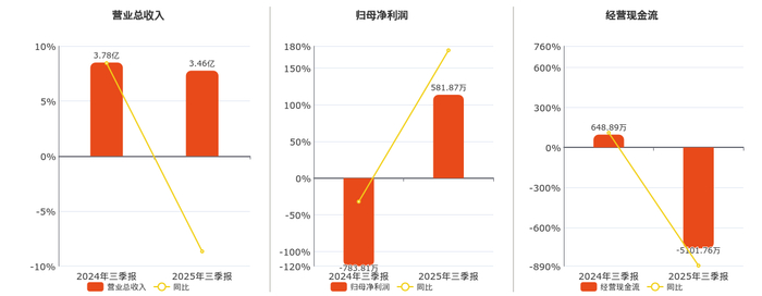 公司营业总收入为3.46亿元。归母净利润为581.87万元,较去年同报告期归母净利润增加1365.68万元。经营活动现金净流入为-5101.76万元。