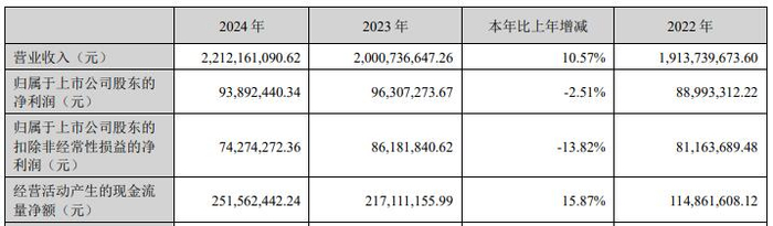2024年,公司实现营业收入22.12亿元,同比增长10.57%;归属于上市公司股东的净利润9389.24万元,同比下降2.51%;归属于上市公司股东的扣除非经常性损益的净利润7427.43万元,同比下降13.82%;经营活动产生的现金流量净额为2.52亿元,同比增长15.87%。