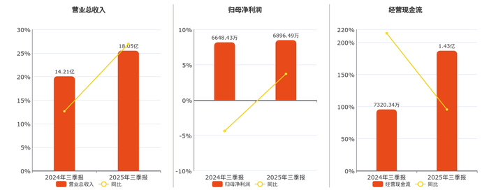 公司营业总收入为18.05亿元。归母净利润为6896.49万元。经营活动现金净流入为1.43亿元。