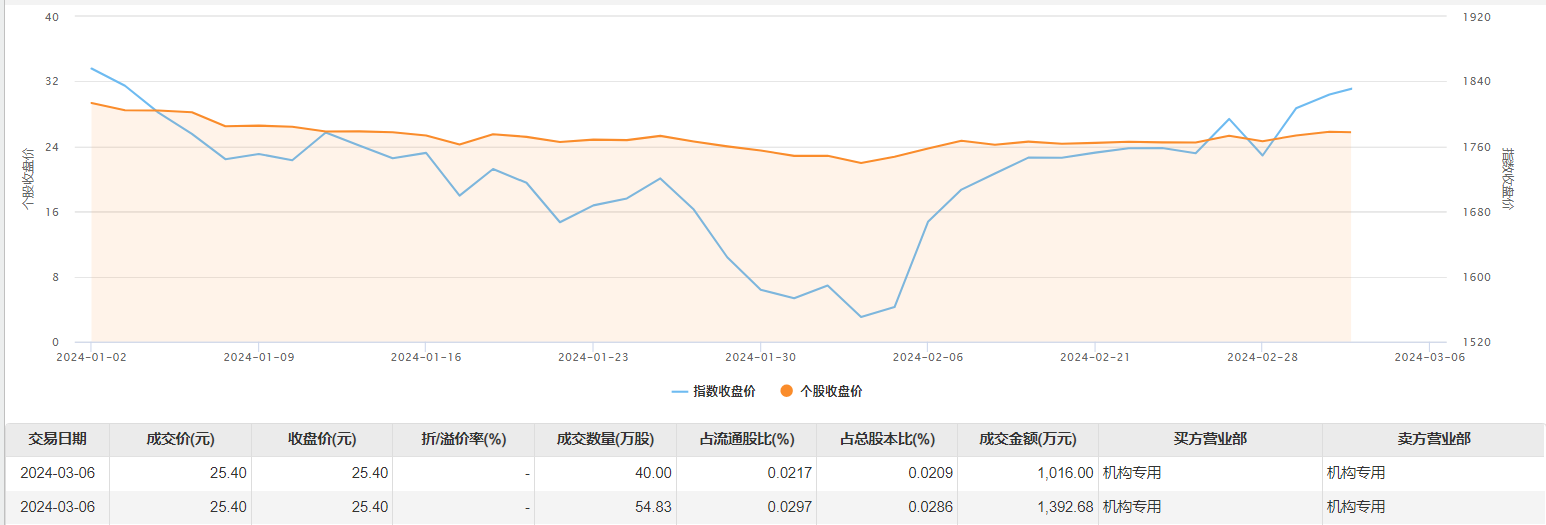 3月6日大宗交易成交94.83万股,成交额2408.68万元,占当日总成交额的11.58%,成交价25.4元,较市场收盘价25.4元持平。