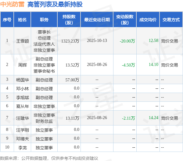 证券之星消息,根据10月17日市场公开信息、上市公司公告及交易所披露数据整理,中光防雷(300414)最新董监高及相关人员股份变动情况:2025年10月16日公司董事,高管王雪颖共减持公司股份10.0万股,占公司总股本为0.0307%。变动期间公司股价上涨4.25%,10月16日当日收盘报12.75元。