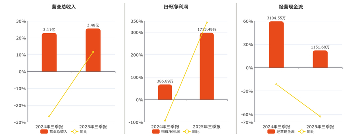公司营业总收入为3.48亿元,在已披露的同业公司中排名第38。归母净利润为1713.49万元。经营活动现金净流入为1151.68万元,在已披露的同业公司中排名第29,较去年同报告期经营活动现金净流入减少1952.86万元,同比较去年同期下降62.90%。