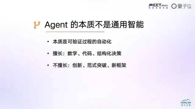 我想分享一下我们对于Agent的认知,我们认为Agent的本质并不是通用的人工智能,而是可验证过程的自动化,非常擅长数学、代码、结构化决策,但并不擅长创新、范式突破、新框架。