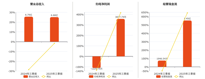公司营业总收入为6.68亿元,较去年同报告期营业总收入减少1179.63万元,同比较去年同期下降1.74%。归母净利润为3877.74万元。经营活动现金净流入为1.45亿元。