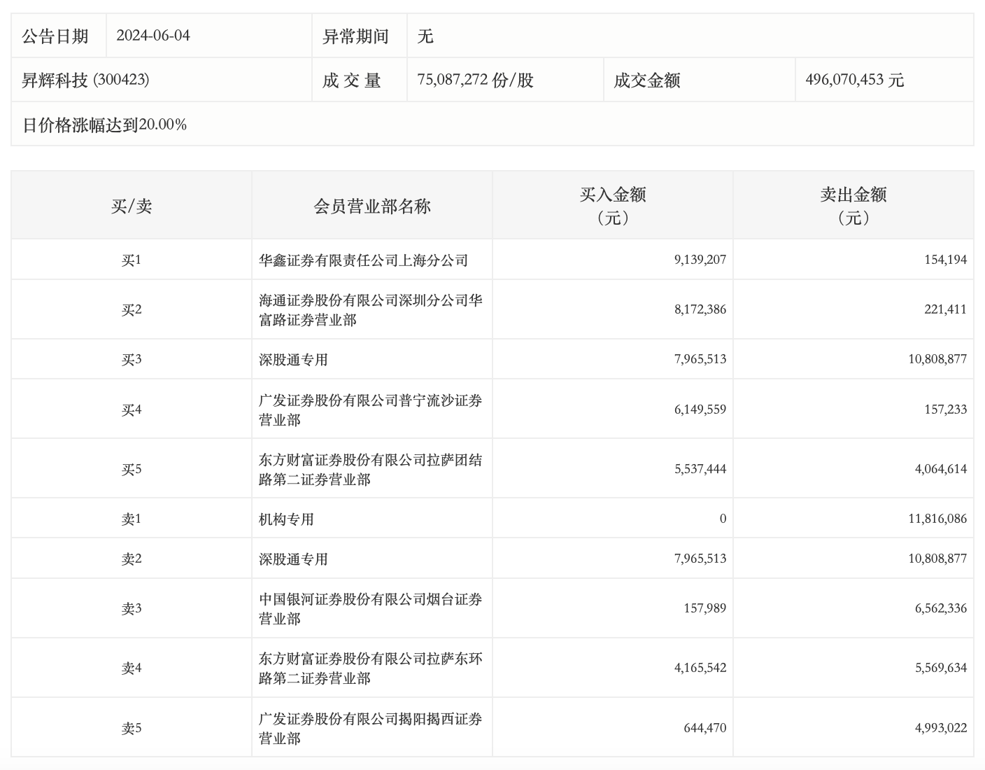 6月4日,昇辉科技今日涨停,龙虎榜数据显示,上榜营业部席位全天成交8627.95万元,占当日总成交金额比例为17.39%。其中,买入金额为4193.21万元,卖出金额为4434.74万元,合计净卖出241.53万元。