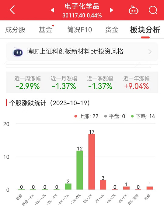 中国经济网北京10月19日讯 今日,电子化学品板块整体涨幅0.44%,其中,22只股票上涨,0只股票平盘,14只股票下跌。