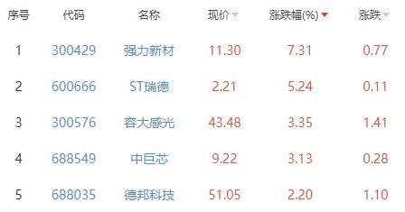 其中,强力新材、ST瑞德、容大感光、中巨芯、德邦科技位列板块涨幅前五位,涨幅分别为7.31%、5.24%、3.35%、3.13%、2.20%。
