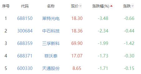 莱特光电、中石科技、三孚新科、菲沃泰、天通股份位列涨幅榜后五位,涨幅分别为-3.48%、-2.34%、-1.99%、-1.73%、-1.71%。