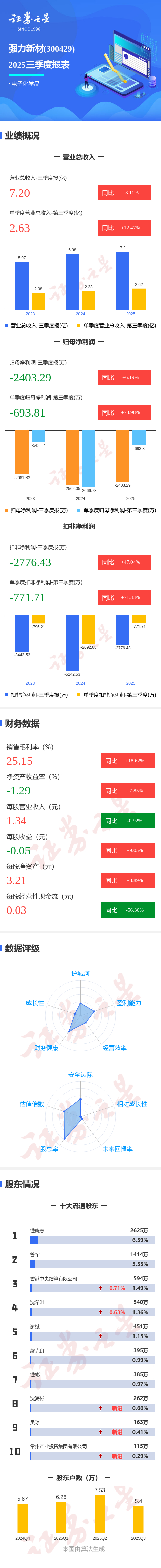 图解强力新材三季报:第三季度单季净利润同比增长73.98%