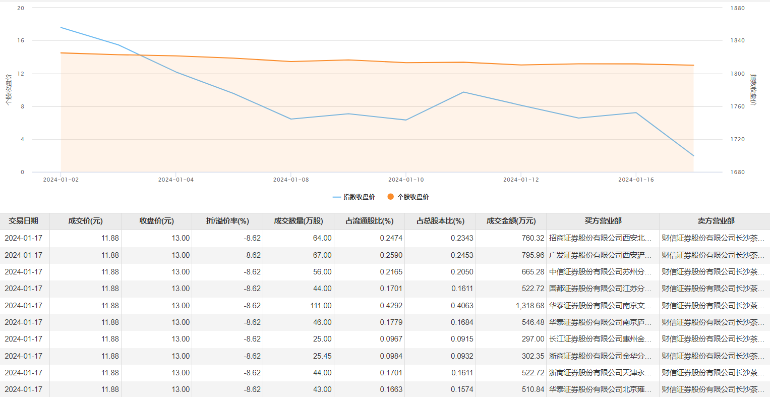 1月17日大宗交易成交525.45万股,成交额6242.35万元,占当日总成交额的66.01%,成交价11.88元,较市场收盘价折价8.62%。