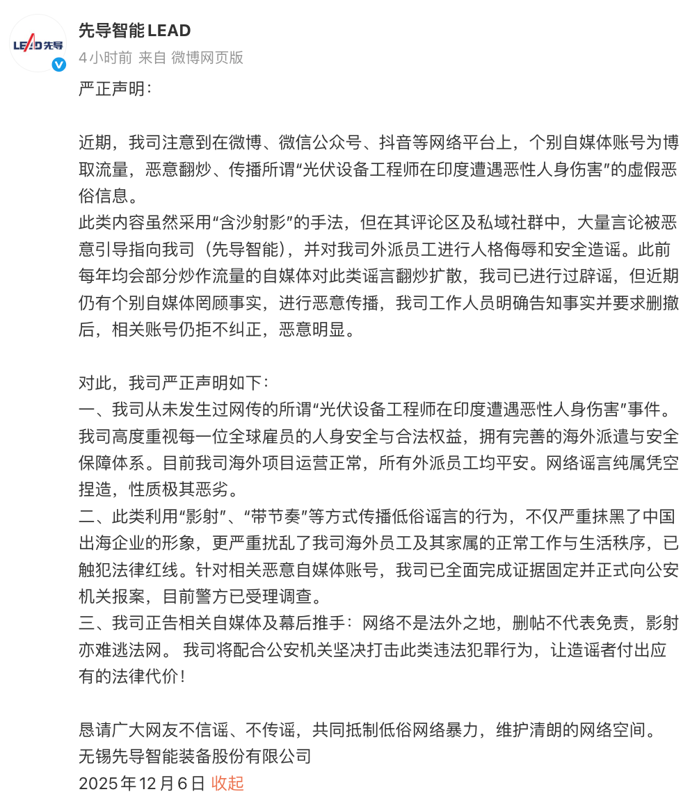 近期,我司注意到在微博、微信公众号、抖音等网络平台上,个别自媒体账号为博取流量,恶意翻炒、传播所谓“光伏设备工程师在印度遭遇恶性人身伤害”的虚假恶俗信息。