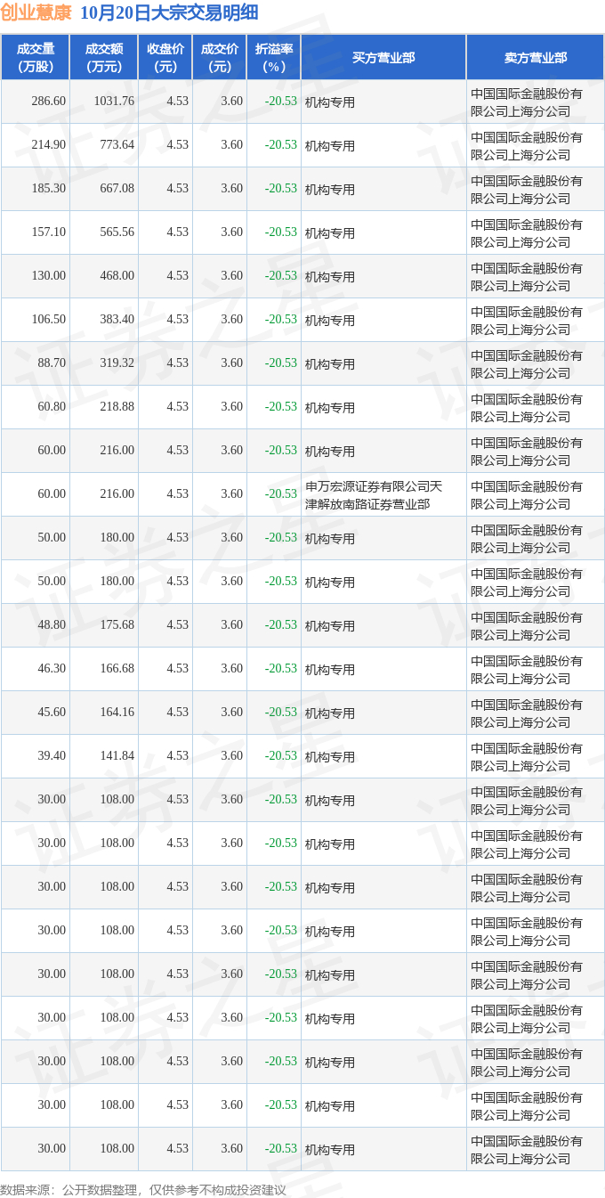 10月20日创业慧康现25笔折价20.53%的大宗交易 合计成交6840万元