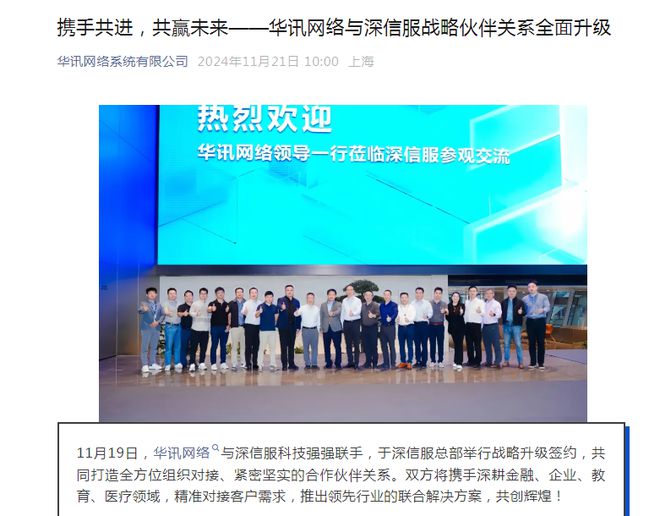科技于深信服总部举行战略升级签约,共同打造全方位组织对接、紧密坚实的合作伙伴关系。此次战略升级签约,标志着华讯网络与深信服的合作迈入全新高度。