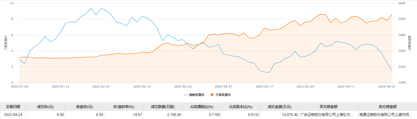 4月24日大宗交易成交2156万股,成交额1.49亿元,占当日总成交额的2.57%,成交价6.9元,较市场收盘价8.59元折价19.67%。