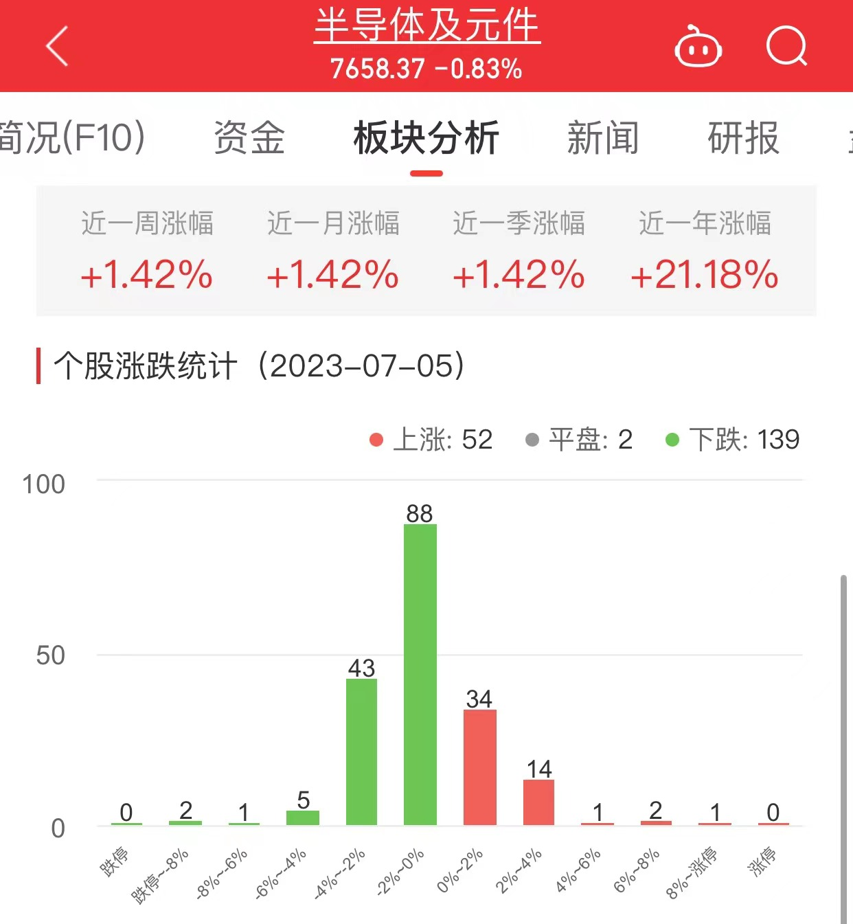 中国经济网北京7月5日讯 今日,半导体及元件板块整体跌幅0.83%,其中52只股票上涨,2只股票平盘,139只股票下跌。