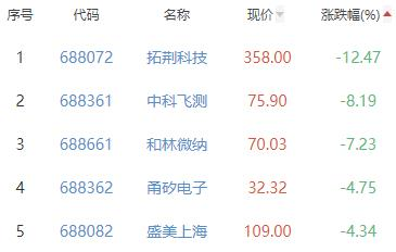 拓荆科技、中科飞测、和林微纳、甬矽电子、盛美上海位列涨幅榜后五位,涨幅分别为-12.47%、-8.19%、-7.23%、-4.75%、-4.34%。
