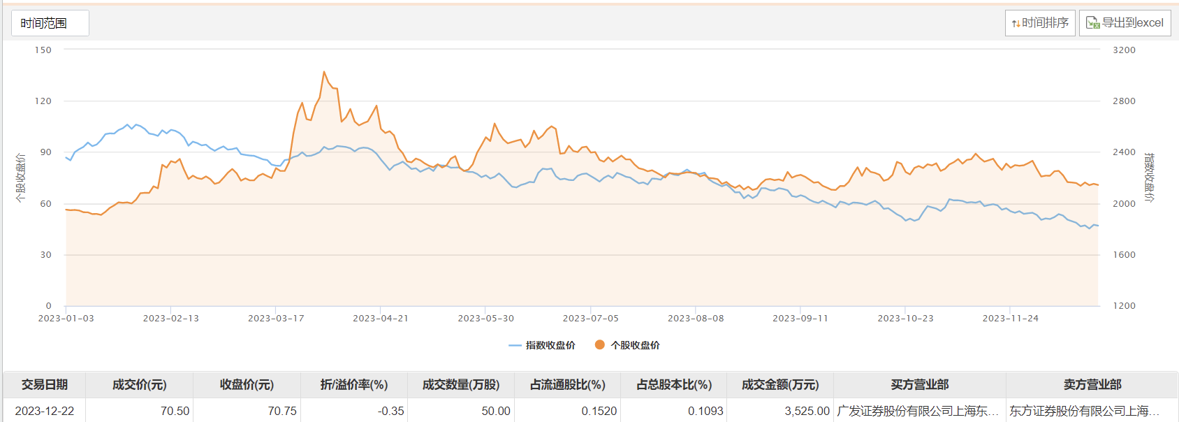 今日大宗交易成交50万股,成交额3525万元,占当日总成交额的9.12%,成交价70.5元,较市场收盘价折价0.35%。