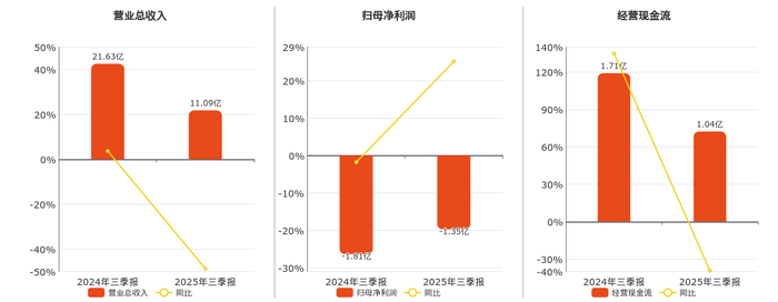 公司营业总收入为11.09亿元,较去年同报告期营业总收入减少10.53亿元,同比较去年同期下降48.72%。归母净利润为-1.35亿元。经营活动现金净流入为1.04亿元,较去年同报告期经营活动现金净流入减少6710.66万元,同比较去年同期下降39.29%。