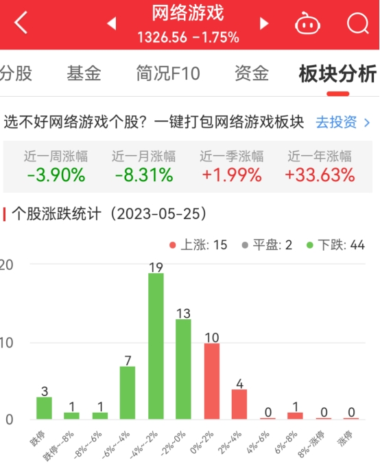 中国经济网北京5月25日讯今日,网络游戏板块整体跌幅1.75%,其中15只股票上涨,2只股票平盘,44只股票下跌。