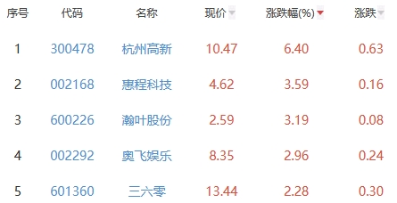 其中,杭州高新、惠程科技、瀚叶股份、奥飞娱乐、三六零位列板块涨幅前五位,涨幅分别为6.40%、3.59%、3.19%、2.96%、2.28%。