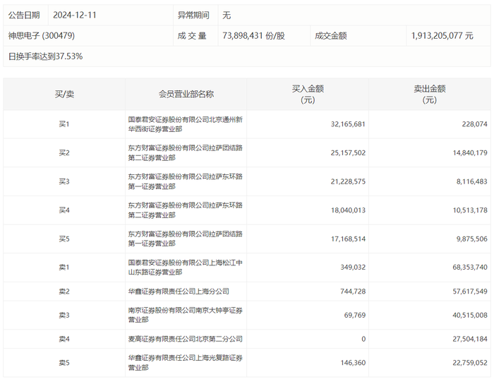 神思电子今日跌0.08%,龙虎榜数据显示,上榜营业部席位全天成交3.75亿元,占当日总成交金额比例为19.62%。其中,买入金额为1.15亿元,卖出金额为2.6亿元,合计净卖出1.45亿元。