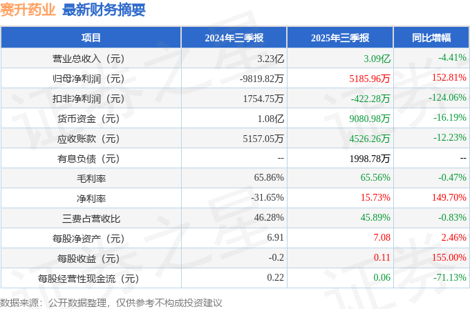 据证券之星公开数据整理,近期赛升药业(300485)发布2025年三季报。根据财报显示,赛升药业净利润同比增长152.81%。截至本报告期末,公司营业总收入3.09亿元,同比下降4.41%,归母净利润5185.96万元,同比上升152.81%。按单季度数据看,第三季度营业总收入1.12亿元,同比上升3.5%,第三季度归母净利润407.33万元,同比下降41.41%。