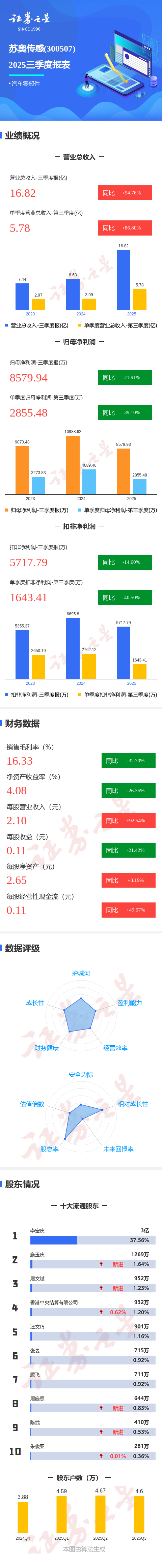 证券之星消息,苏奥传感2025年三季报显示,公司主营收入16.82亿元,同比上升94.76%;归母净利润8579.94万元,同比下降21.92%;扣非净利润5717.79万元,同比下降14.61%;其中2025年第三季度,公司单季度主营收入5.78亿元,同比上升86.8%;单季度归母净利润2855.48万元,同比下降39.11%;单季度扣非净利润1643.41万元,同比下降40.5%;负债率38.27%,投资收益2634.99万元,财务费用-76.63万元,毛利率16.33%。