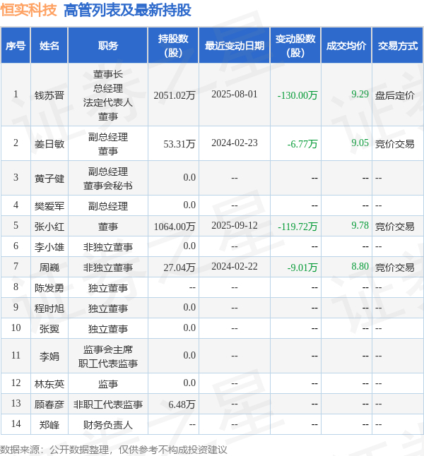 恒实科技近半年内的董监高及核心技术人员增减持详情如下: