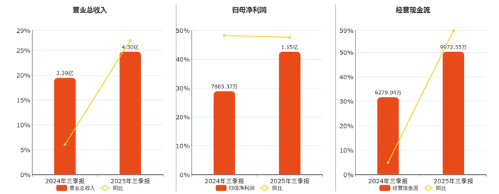 公司营业总收入为4.30亿元。归母净利润为1.15亿元。经营活动现金净流入为9972.55万元。