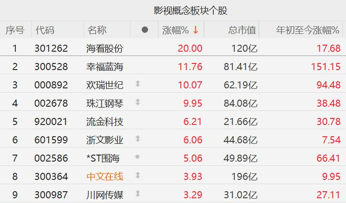 A股影视概念股逆势上涨,幸福蓝海涨近12%