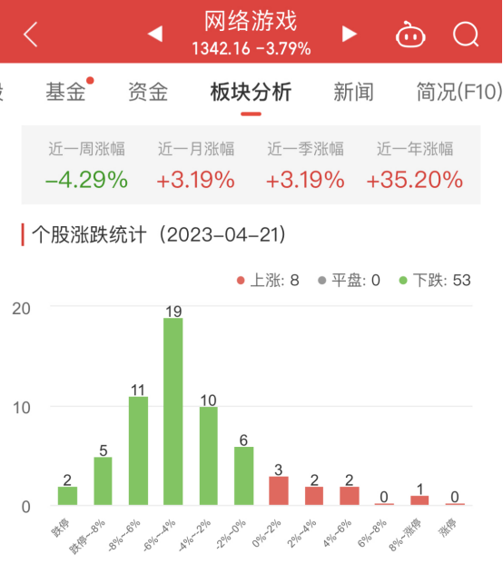 中国经济网北京4月21日讯今日,网络游戏板块整体跌幅3.79%,其中8只股票上涨,0只股票平盘,53只股票下跌。