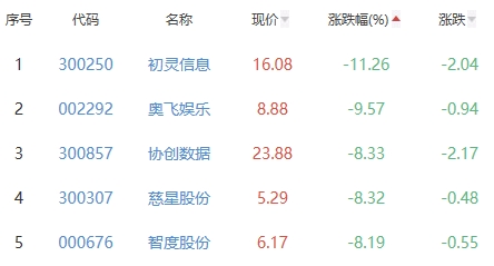初灵信息、奥飞娱乐、协创数据、慈星股份、智度股份位列涨幅榜后五位,涨幅分别为-11.26%、-9.57%、-8.33%、-8.32%、-8.19%。