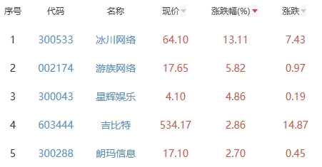 其中,冰川网络、游族网络、星辉娱乐、吉比特、朗玛信息位列板块涨幅前五位,涨幅分别为13.11%、5.82%、4.86%、2.86%、2.70%。